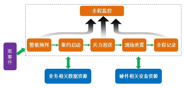 (一)背景與挑戰 近年來(lái),受地質(zhì)、氣候、治安情況、恐怖活動(dòng)等多方面原因,重大突發(fā)事件上升趨勢明顯,面對如四川“5.12”特大地震、南昌男孩被拐賣(mài)、青島輸油管道爆炸、昆明嚴重暴力恐怖案件、杭州公交縱火案等突發(fā)應急事件,如何及時(shí)有效應對與處置,對各地指揮中心隊伍及信息化系統建設提出了考驗。 各級公安機關(guān)指揮中心在工作中不斷總結經(jīng)驗,不斷提高指揮體系的實(shí)戰能力,逐步形成省、市、縣公安指揮體系三級聯(lián)網(wǎng)。為完成常態(tài)接警處警、重大案件偵辦、突發(fā)事件處置、安全保衛、災情救助等,對公安機關(guān)快速、有效的指揮調度保障體系統提出更高的要求。 (二)解決方案 指揮調度業(yè)務(wù)流程抽象如下圖所示:
