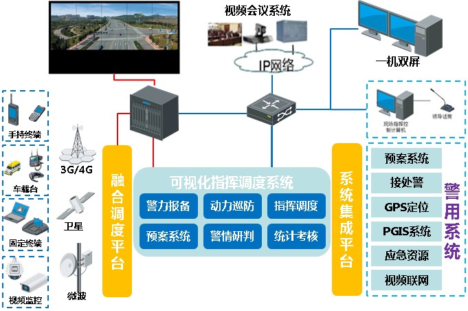 可視化指揮調度系統通過(guò)信息采集與視頻監控實(shí)時(shí)收集現場(chǎng)的案事件進(jìn)展情況、處置力量行動(dòng)處置狀態(tài)、社會(huì )聯(lián)動(dòng)單位狀況等各方面信息,以情報分析、態(tài)勢展現、指揮保障為支撐,達到合理規劃資源,實(shí)時(shí)掌握處置力量動(dòng)態(tài)情況,監控、督導執行情況,對所屬各個(gè)處置力量進(jìn)行有效指揮。