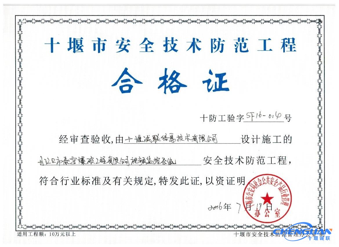 丹江口市泰安爆破工程有限公司視頻監控系統驗收合格 ![]() 丹江口市泰安爆破工程有限公司視頻監控系統01 ![]() 丹江口市泰安爆破工程有限公司視頻監控系統02 ![]() 丹江口市泰安爆破工程有限公司視頻監控系統03 ![]() 丹江口市泰安爆破工程有限公司視頻監控系統04 ![]() 丹江口市泰安爆破工程有限公司視頻監控系統05 ![]() 丹江口市泰安爆破工程有限公司視頻監控系統06 |